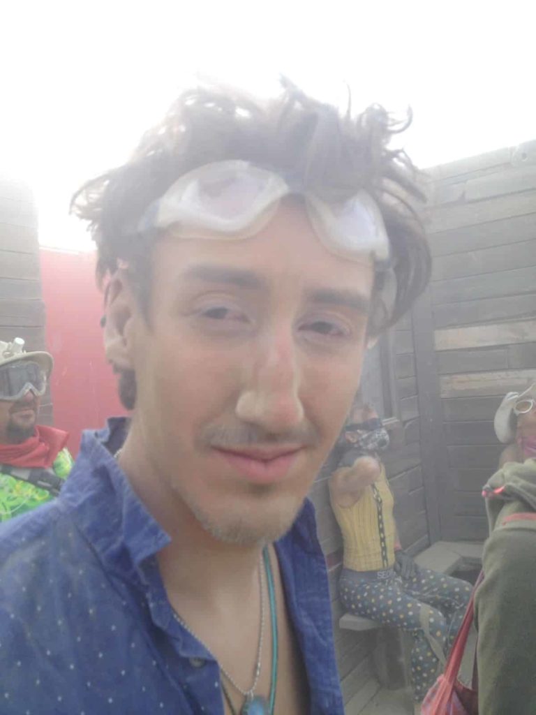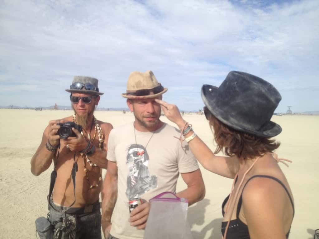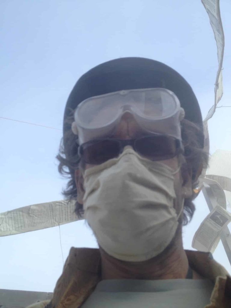 Der erste Tag waren ziemlich heiß und sonnig und wir halfen am Camp, ein großes Schattendach für die Zelte aufzubauen. Abends hieß es dann Sandsturm mit 50 mph und unsere Schattenstruktur hielt grade so stand. Der Sandsturm sollte leider nicht der letzte bleiben. Susanne konnte es kaum glauben, während ihrer letzten Besuche fuhren die Leute ab und zu direkt in die „whiteouts“, die Stürme, hinein, um einmal dieses Sturmerlebnis zu haben, die Faszination wie alles im Staub verschwindet und verschwimmt. Wir dagegen kamen teilweise stundenlang gar nicht mehr aus den Stürmen raus! Jeden Tag legte sich eine feine Staubschicht auf wirklich alles nieder und drang sogar durch die Zelte bis nach Innen ein. Goggles und Mundschutz wurden wirklich unersetzliche Teile der Playaausrüstung, ebenso wie die abendliche Katzenwäsche mit Baby Wipes und das anschließende Eincremen. Der Playastaub trocknete alles aus und führte zu den riesigsten Popeln, die wir jemals in der Nase hatten!