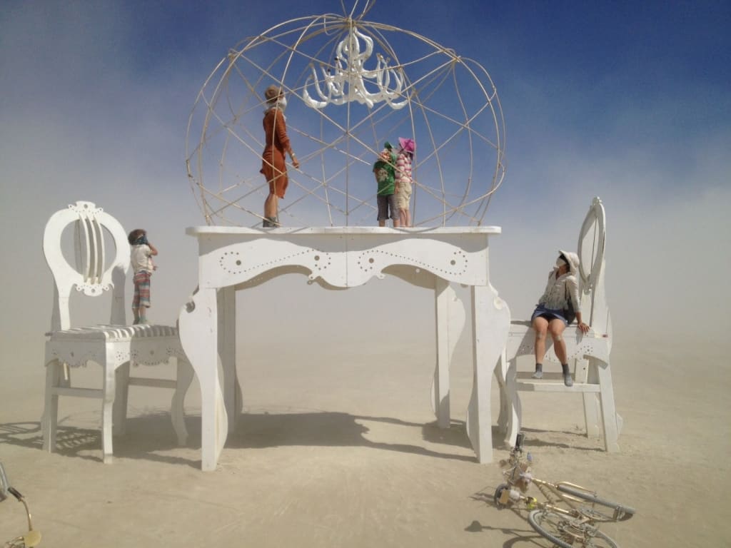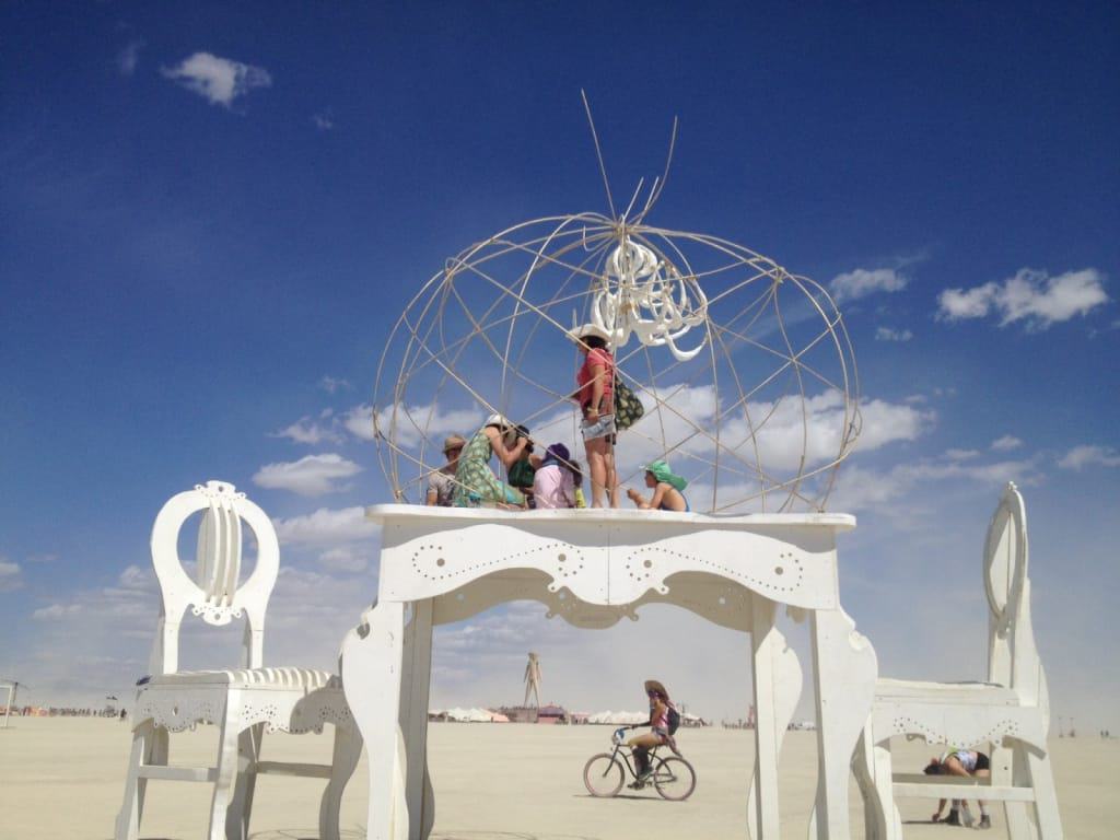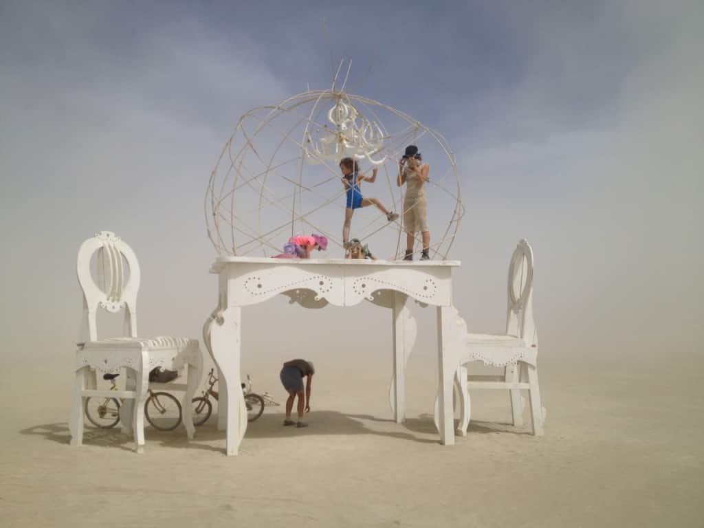 Und jeden Tag zog es uns zu unserem Tisch, der Standardsatz war: ich fahr mal zum Klo und dann noch schnell am Tisch vorbei! Und jedes Mal war er gut besucht und belebt und die verschiedenste Dinge fahnden dort statt. Einmal kam das Pinhole Project vorbei und machte mit einer riesigen Lockkamera ein Photo von uns allen auf dem Tisch, ein andermal parkte ein Art Car mitten im Sandsturm daneben und beschallte eine Handvoll Tanzwütiger!
