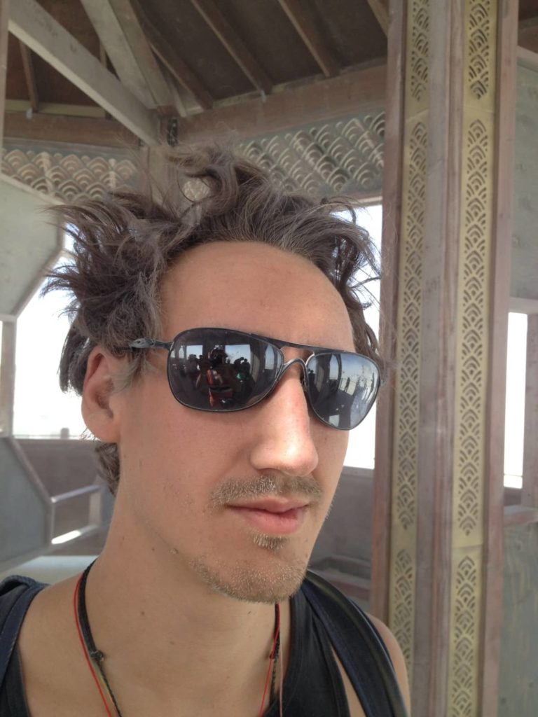 Nach dem Leave no Trace am Mazu Tempel fahre ich eine Stunde alleine in die Deep Playa und halte an einer kleinen Bude, drinnen sitzt ein Wahrsager, der mir vorhersagt: „You are a very magical person and you carry a lot of love inside you that you share with others through your art projects“. Ich radle weiter, lande hier und dort und dann am TrashFence, das ist der Zaun, der das hinterste Ende der Playa markiert, an einer weiteren Bude mit kleinen Spiegeln in der Wand. Ich schaue hinein und sehe, das ich nicht nur sehr magisch aussehe, sondern auch sehr staubig und sehr sehr dreckig von der Asche des Mazutempels.