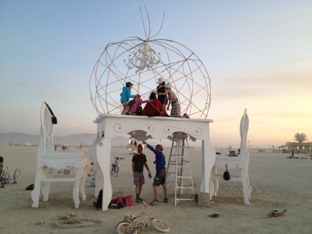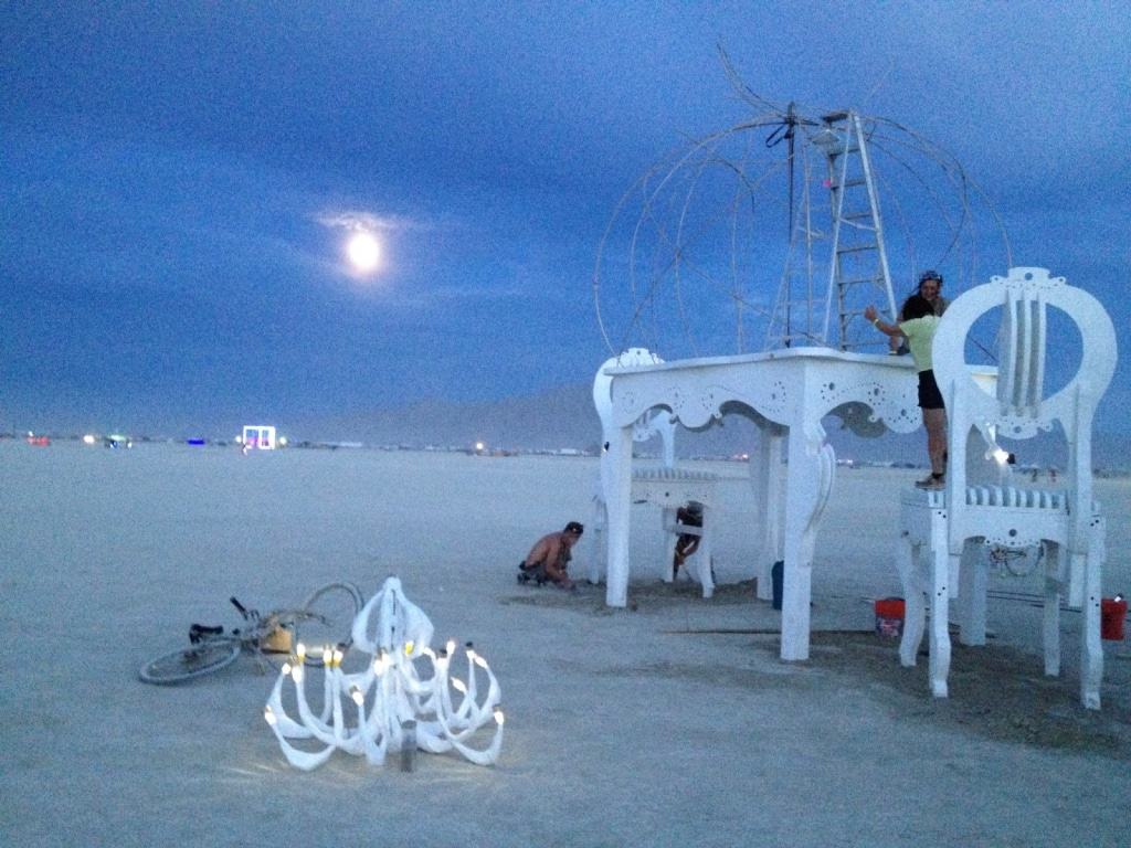 Der Tisch und die beiden Stühle waren recht schnell aufgebaut, der Dom aus Moniereisen war schon etwas Tricky und David und Raoul arbeiteten sich eisern durch, hielten jedem Sandsturm stand und hörten erst auf, bis auch wirklich jede Strebe saß. So ganz schafften wir es nicht bis zum Sonntagfrüh fertig zu werden, der allerletzte Schliff, die Beleuchtung fehlte noch und wurde erst am Sonntagabend erprobt, danach war es Zeit, unser Riesenbaby freizugeben und uns von ihm zu verabschieden. Geschichten besagen, dass der Tisch auch schon in der selben Nacht erobert und entjungfert wurde: Ein Paar hatte ihn zum Liebesnest erkoren! Andere berichteten, dass der Dom von fünf Männern gleichzeitig bestiegen wurde! So war das aber nicht gedacht! Zwei Frauen kamen jeden Abend zurück und luden zur Teezeremonie auf dem Tisch ein! David wurde einmal Zeuge einer Hochzeit und Nelio und ich beobachteten eine Frau, die auf unserem Tisch Schlangenakrobatik vollführte.