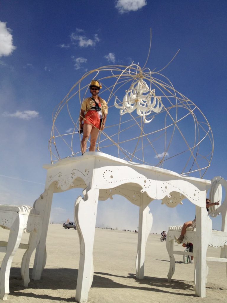 Susanne und ich kamen so in den Genuss von besonders vielen Burner Hugs, langen und innigen Umarmungen, manche so intensiv das uns fast die Tränen kamen, so viele bedankten sich bei uns und waren sehr bewegt, als sie wieder hinuntergeleitet wurden. Ich war jedenfalls sehr beglückt, und hatte das Gefühl, egal was mit Brobdingnag die nächsten Tage geschieht, ob er standhalten oder der Pappmaché Kronleuchter kaputt gehen würde, wir haben das Projekt zu einem erfolgreichen Ende gebracht. Das schöne war, mitzuerleben, dass tatsächlich, auch als die Partycrowd kam, nichts kaputt gemacht wurde und Brobdingnag bis zum letzten Tag standhielt! Nur der Kronleuchter war am Ende etwas vom Wind gebeutelt!