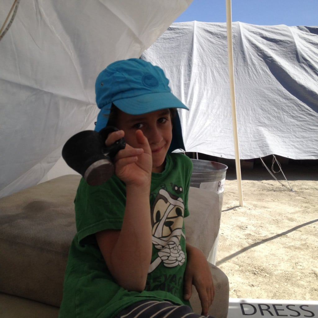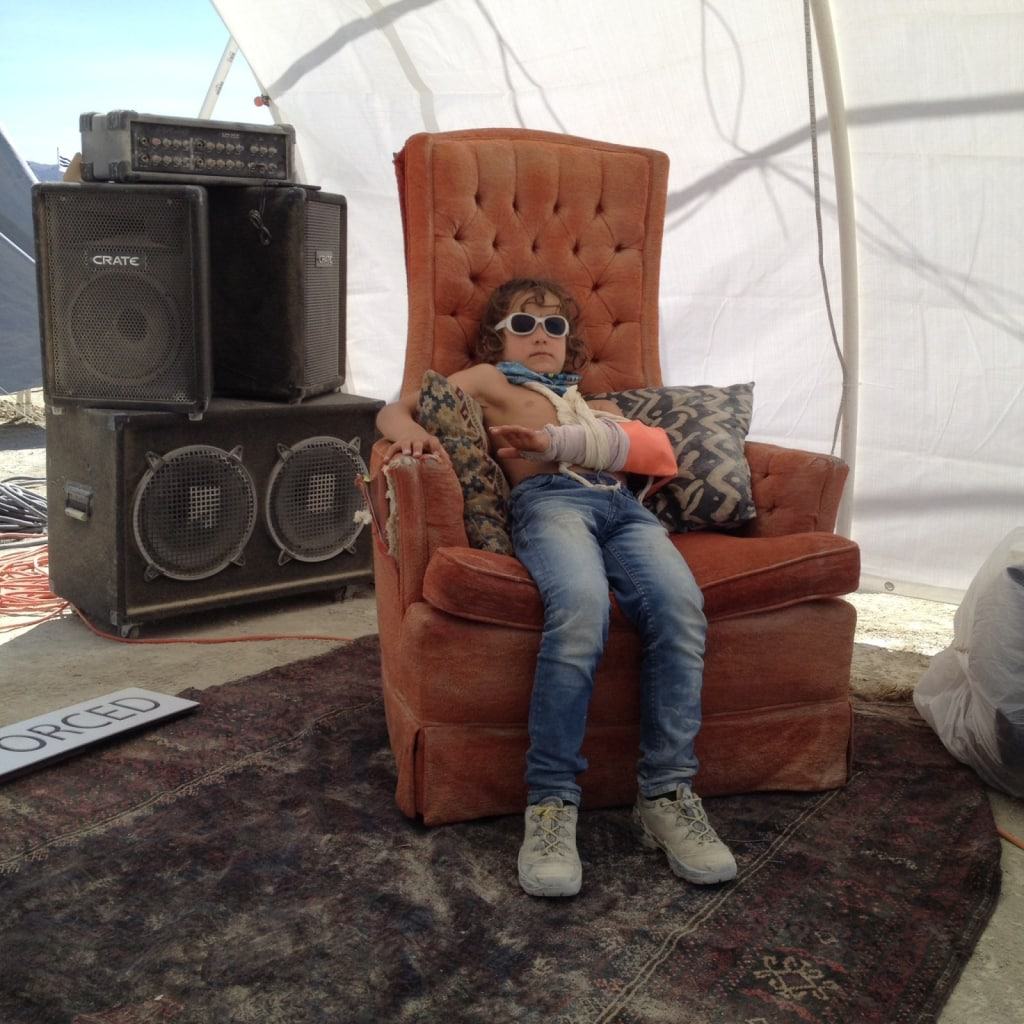 Liam war die ersten Tage dar absolute Playa Hero, düste mit nacktem Oberkörper, mit Ketten behängt und wilden Locken auf seinem goldenen Fahrrad über die Playa. Leider holte ihn dann ein Sturz etwas auf den Boden zurück. Sein Ellenbogen tat ihm am nächsten Tag immer noch so weh, dass er darauf bestand, ins Black Rock City Hospital zu gehen. Dort gab es tatsächlich Röntgenapparate und er wurde sehr gründlich untersucht und sein Arm per Schiene stillgelegt. Ganze 24 Stunden trug er die Schiene, dann hielt er es nicht mehr aus und meinte, die Schiene störe ihn zu sehr beim Klettern im Foam Dom. Worauf er sie abnahm und wie ein Äffchen über den Schaumstoff hangelte!