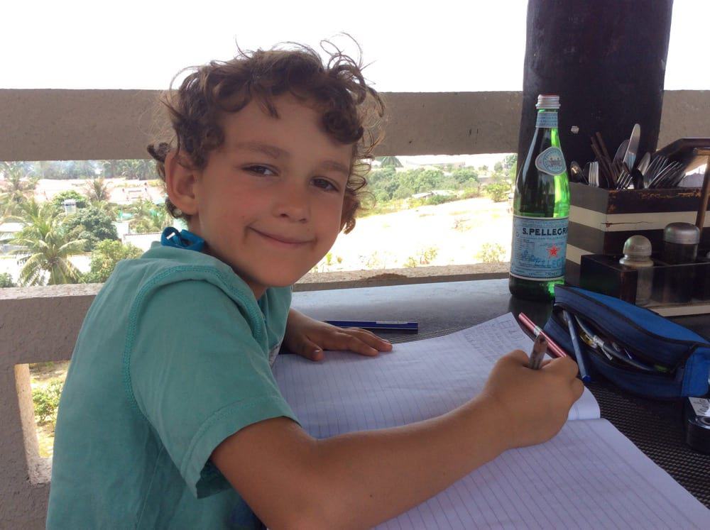 In Japan hatten wir ja eine Zeitlang die kleinen Tische beim 7/11 Supermarkt als Schulbänke genutzt, dann in Tokyo ein Starbucks Café, was schon komfortabler war, aber unsere Terrasse hier neben dem Pool in der Meeresbrise ist bisher noch ungetoppt! Liam vermisst trotzdem seine Schule und am meisten natürlich seine Mitschüler!